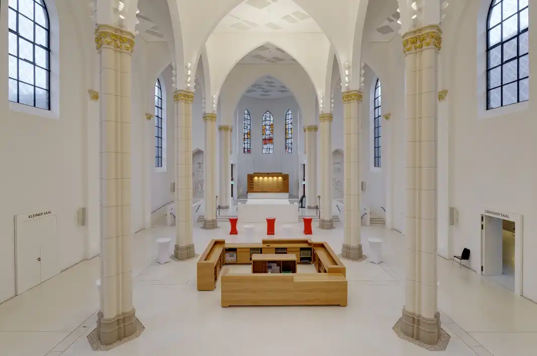 Die grundsätzliche architektonische Entwurfsidee war, die Kirche sowohl als Foyer als auch als Veranstaltungsort zu nutzen. Das macht sie zum Mittelpunkt des Gebäudes, Kernstück und Verbindung zwischen architektonischem Design und Funktion.