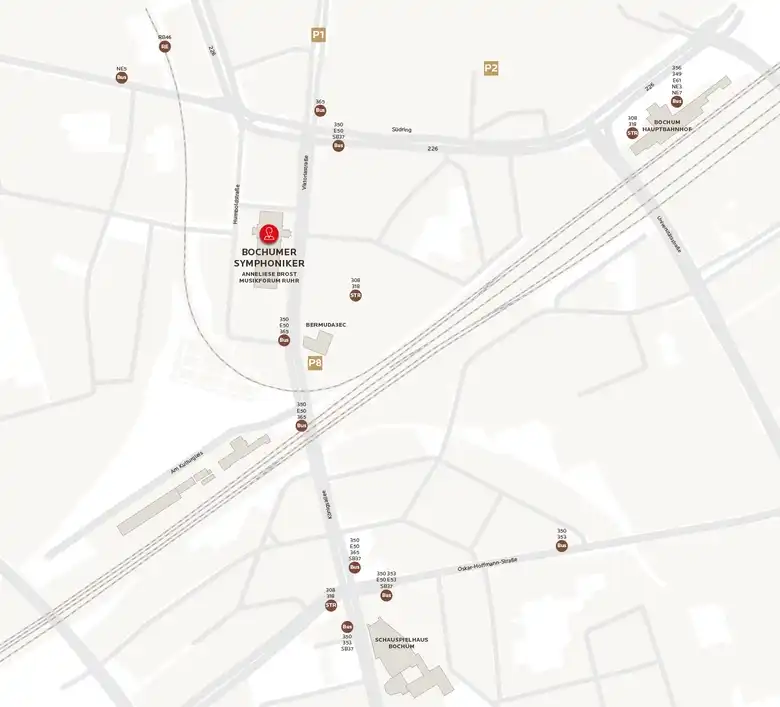 Auf der Universitätsstraße bis zum Ende (Bochum Hbf) fahren, dann links in den Südring einbiegen. An der Kreuzung Viktoriastraße links abbiegen. Die nächste Straße rechts abbiegen (Marienplatz).